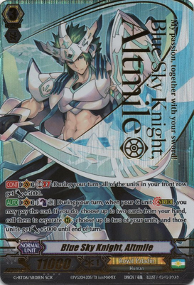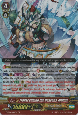 Transcending Altmile at the cost of 1 counter blast can give a strong power buff to the front row(up to +8000 power when all four copies of Aerial Altmile are face up on the G-zone. It's important to note here that the requirements are very loose unlike specific rear guards for Regalie or a good amount of counter blaster for Thing Saver. Basically drop your hand and he turns any of your remaining rear guards to hard hitting trucks. If you can get to this point of the game, Transcending Altmile has crazy amount of game ending power that other Royal decks don't have (extra attacks are nice =D).